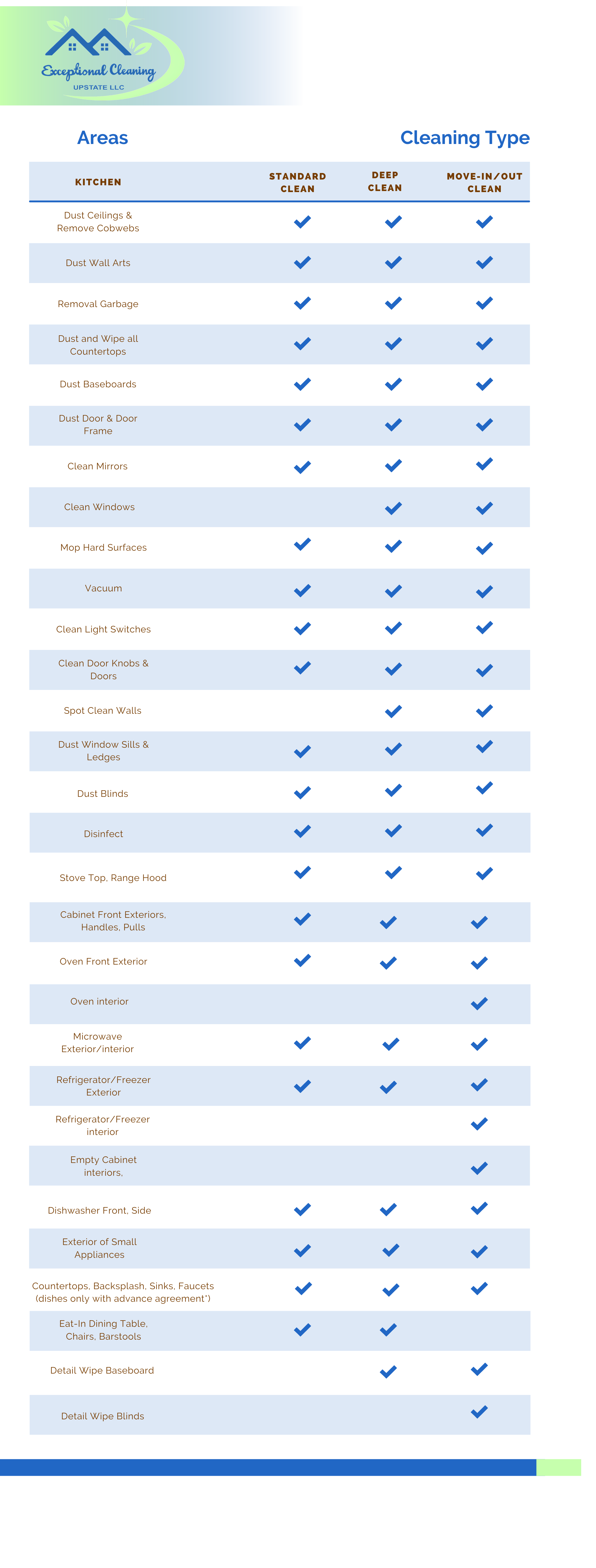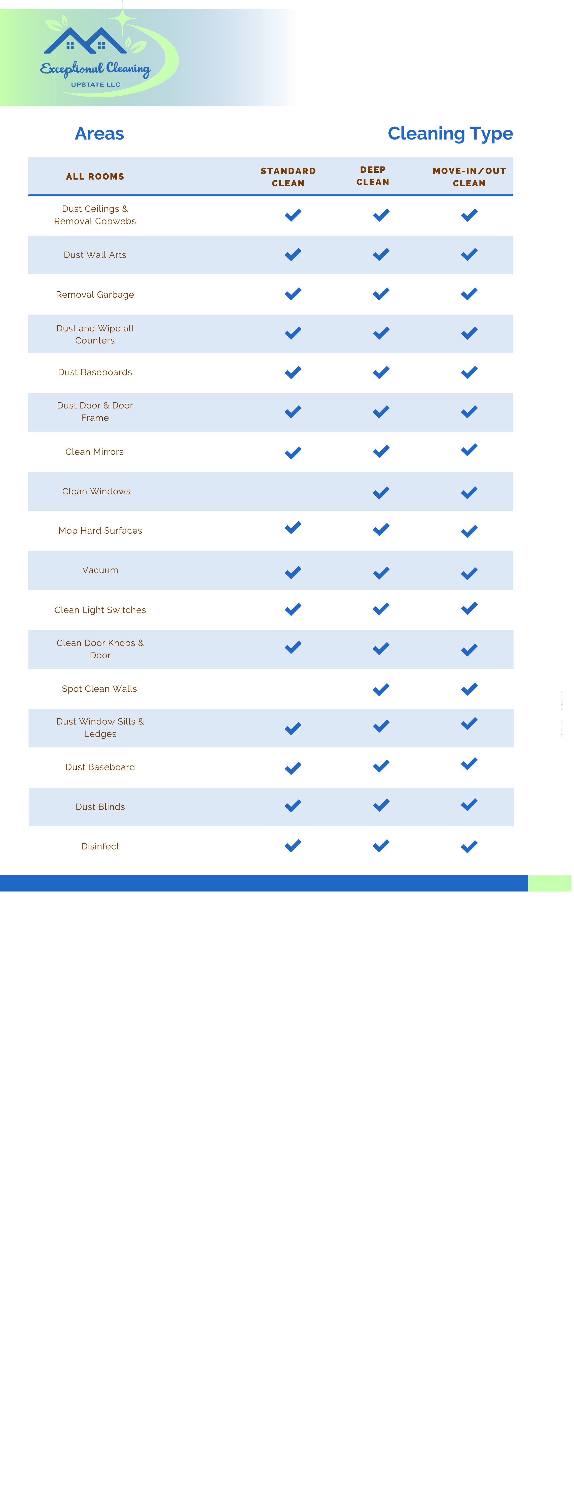 Checklists Service Exclusions Please note the following: Exceptional Cleaning Upstate does not provide the following services: Under Heavy Furniture * Biohazards * Animal Waste * Full Wash Of Walls * Pest Removal * Hard To Reach Areas * Chandeliers Here are the details for our standard, deep, and move-in/out cleaning checklists for your home. Call Now